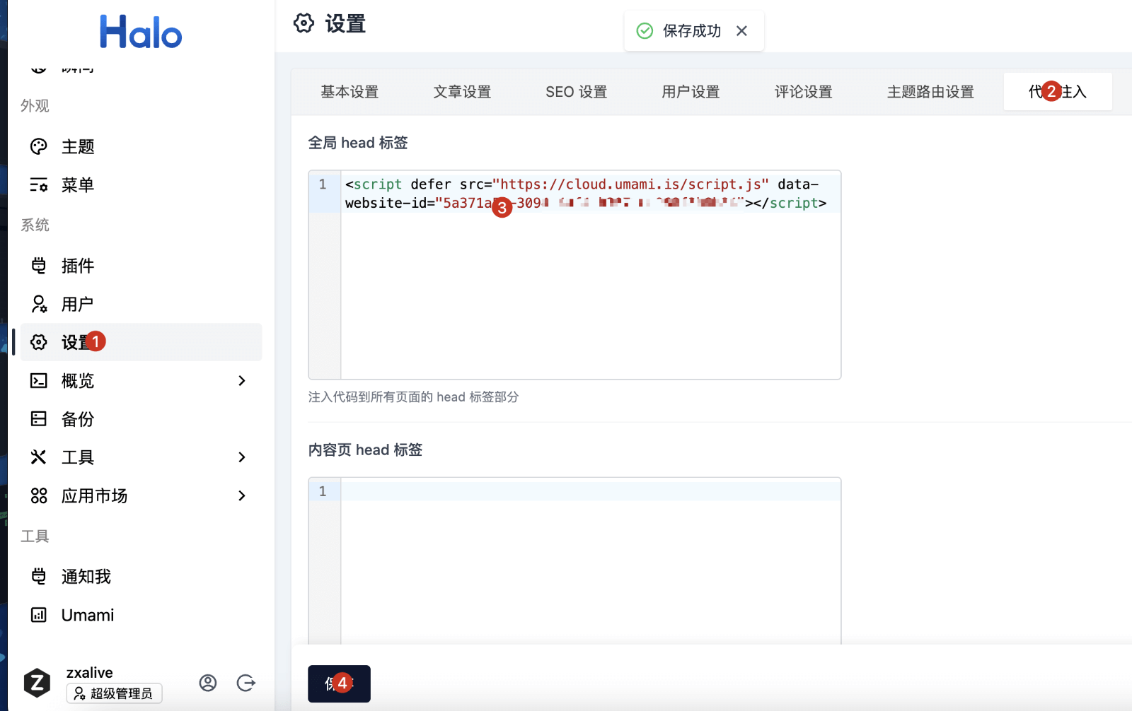 Halo安装Umami插件,补充以下信息,保存